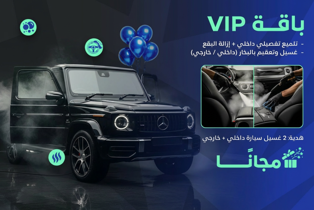 تقدم لك باقة العيد الملكية (VIP) تجربة عناية متكاملة لسيارتك مع أفضل خدمة غسيل سيارات بالبخار في الرياض. تشمل الباقة تلميع تفصيلي داخلي احترافي مع إزالة البقع، بالإضافة إلى غسيل وتعقيم بالبخار (داخلي + خارجي) ليعود مظهر سيارتك نظيفًا ولامعًا كالجديد.